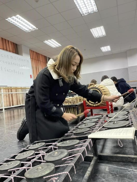 在学习歌曲的同时,负责器乐传承的民间艺人向国乐系的学生进行了傣族传统器乐的讲解与示范。由于艺人们都是口传心授进行教学,对于乐谱的记录与留存具有局限性,所以由学生现场记谱并进行演奏学习。在学习演奏傣族乐器云铓的过程中不难发现,该乐器由两个八度的音构成,演奏时多采用八度交替的形式,在这一特性中,蹦duang(钢片琴)的演奏方式与其类似。