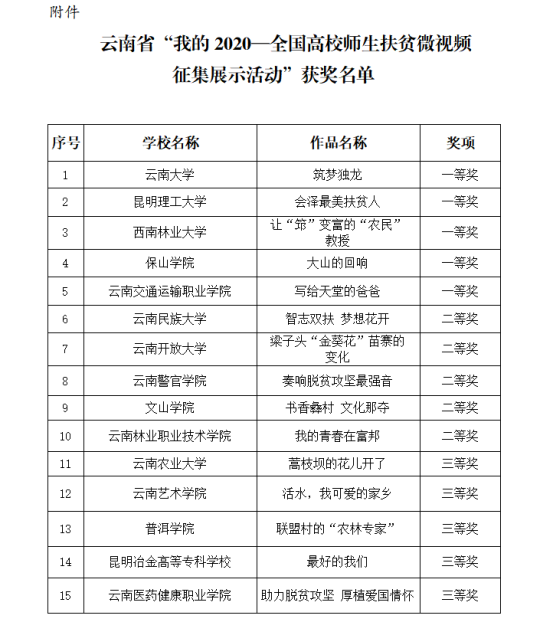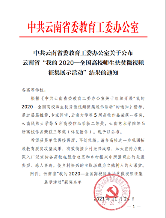 滚球买球的app官网民族声乐系系主任陈红玲教授的作品《活水,我可爱的家乡》在云南省委教育工委组织的“我的2020全国高校师生扶贫微视频征集展示活动”中荣获三等奖。