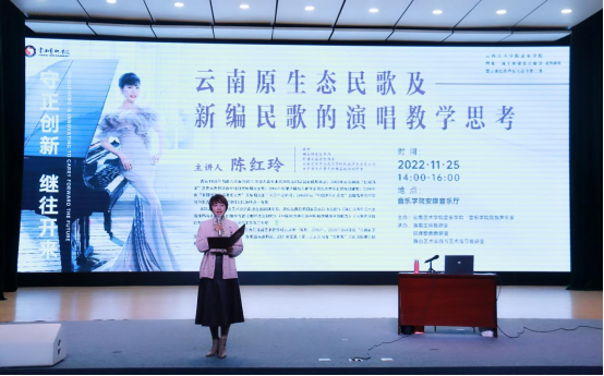 2022年11月25日下午,国家一流专业建设点建设系列讲座暨云南民族声乐大讲堂第二期“守正创新 继往开来”——云南原生态民歌及新编民歌的演唱教学思考在滚球买球的app官网安康音乐厅开讲。本次讲座由滚球买球的app官网院长林林教授主持,滚球买球的app官网民族声乐系系主任陈红玲教授主讲。讲座采用线上线下的同步观看方式,引起业内的高度关注与好评。