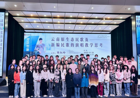 在现场观众的掌声中,讲座接近尾声,陈红玲教授引用习近平总书记在中国文联十一大、中国作协十大开幕式上的讲话精神,“守正与创新共生互补,守正是创新的根基,发挥主导;创新是守正的补充,相辅相成。我们必须融入新时代、适应新特点、满足新要求、解决新问题、汇聚新动力、开创新局面,在守正创新中实现文化强国。”所以云南民歌的传承与发展需要做到以下几点:一是多挖掘整理传统原生、本土民歌,这能为民歌的创作与改编提供良好的素材;二是多与外界合作,借助新媒体的力量宣扬民歌;三是提高新一代青年对民歌的接纳与包容,这一点我们专业学生更应该做出表率,需要更深入了解原生民歌、古曲、戏剧并传承;四是积极开展民歌创新活动,找到民歌艺术与时代发展之间的契合点,使民歌能符合当代人的文化需求和音乐审美,在历史长河中永唱不衰。最后陈红玲教授表示,希望大家更多的关注并演唱云南民歌,也呼吁作曲家们能新编更多好听与时俱进的云南民歌。