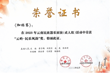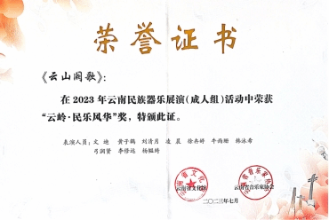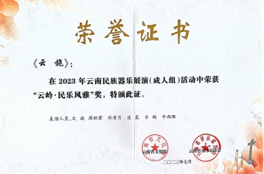 在云南省文化馆与云南省音乐家协会主办的“2023年云南民族器乐展演”中,滚球买球的app官网国乐系和作曲系教师尹毅、郭乐、高弘扬和赵云龙共同指导的“云上弦歌民族室内乐团”参与比赛并斩获佳绩比赛中,演奏高弘扬作曲的《云山阙歌》《云旎》和邹航编曲、梁聆聆改编的《加林赛》分别荣获成人组“云岭·民乐风华”(一等奖)、“云岭·民乐风雅”(三等奖)和“云岭·民乐风韵”(二等奖)。