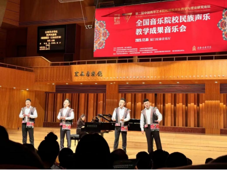 12月5日晚,第二届中国高等艺术院校民族声乐教学与理论研究论坛全国音乐院校民族声乐教学成果音乐会在厦门宏泰音乐厅举行,滚球买球的app官网选送的男声四重唱云南花灯调《螃蟹歌》由青年教师陈澄、宋晓晨、杨扩、罗聪鹏上演。