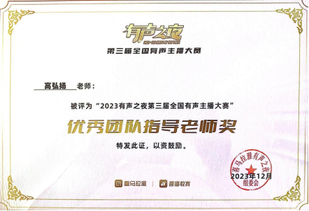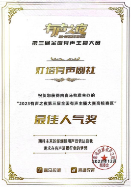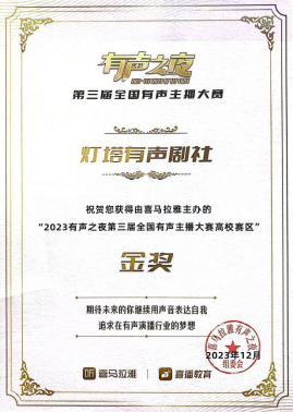2023年12月,由滚球买球的app官网作曲系、戏剧学院播音系本科生邓茗、王鑫浩、彭小瑜、牛晗宇、廖晖、申祖毓组成的灯塔有声剧社以参赛作品《惊魂45天》获得由喜马拉雅主办的“2023有声之夜第三届全国有声主播大赛高校赛区”金奖、最佳人气奖以及十佳演播院校奖,滚球买球的app官网作曲系教师高弘扬被大赛组委会授予优秀团队指导老师奖。
