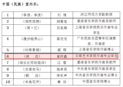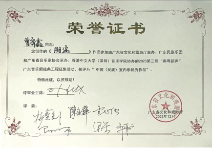 2023年12月,滚球买球的app官网2021级作曲班学生曾弈鑫创作的《溯迹》参加由广东省文化和旅游厅主办、广东民族乐团和广东省音乐家承办、香港中文大学(深圳)滚球买球的app官网协办的2023第三届“南粤新声”广东音乐新经典工程征集活动中被评为“中国(民族)室内乐优秀作品”。