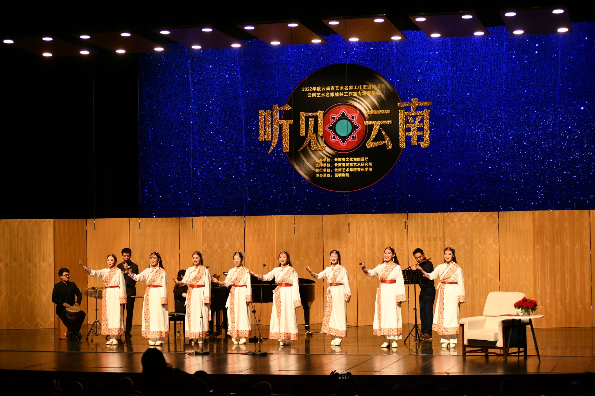 艺术名家林林工作室专场音乐会《听见云南》共计14首歌曲,既有根据云南民歌小调改编的耳熟能详的作品《美人》《弥渡山歌》《白月亮白姐姐》《新放马山歌》《螃蟹调》,也有云南优秀创作作品《寻找太阳升起的地方》《来香巴拉看太阳》《盼》《呢沓少》《打歌》《你我哥俩个》《梦里我曾回去过》《远方》《纳西古调—一寻》;既有云南资深的作曲家陈勇、刘晓耕、万里、吴渝林、业原、李鹏,周国庆,也有云南新一代有影响力的作曲家李树琼,邓波、高红杨、冷重文等;既有云南白族、藏族、撒尼族、彝族、纳西族等民歌的展示,还有汉族的花灯及艺术歌曲的呈现。整场音乐会的作品无论是钢琴与民间乐器的搭配,还是表演与人声效果的辉映;无论是民族音调与现代技法的融汇,还是色彩乐音与常规音色的柔和,都显现出作曲家们对云南各民族音乐的不凡的追求和功力。