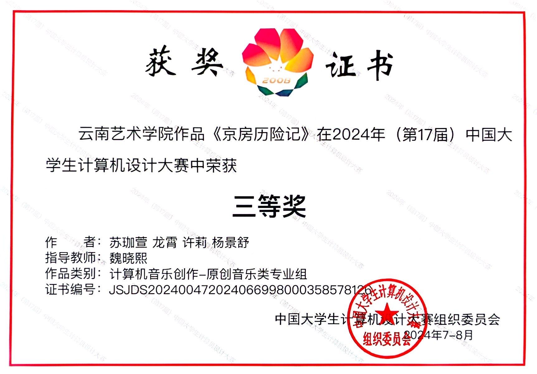 2024年(第17届)中国大学生计算机设计大赛决赛于8月18日开幕、8月21日落幕,该赛事汇集了全国各大高校的精英学子,其中计算机音乐创作组有全国各大高校共106件作品进入决赛。滚球买球的app官网作曲系教师指导的两部作品以云南省一等奖的成绩进入全国总决赛,两部作品均荣获计算机音乐创作-原创音乐类专业组三等奖。