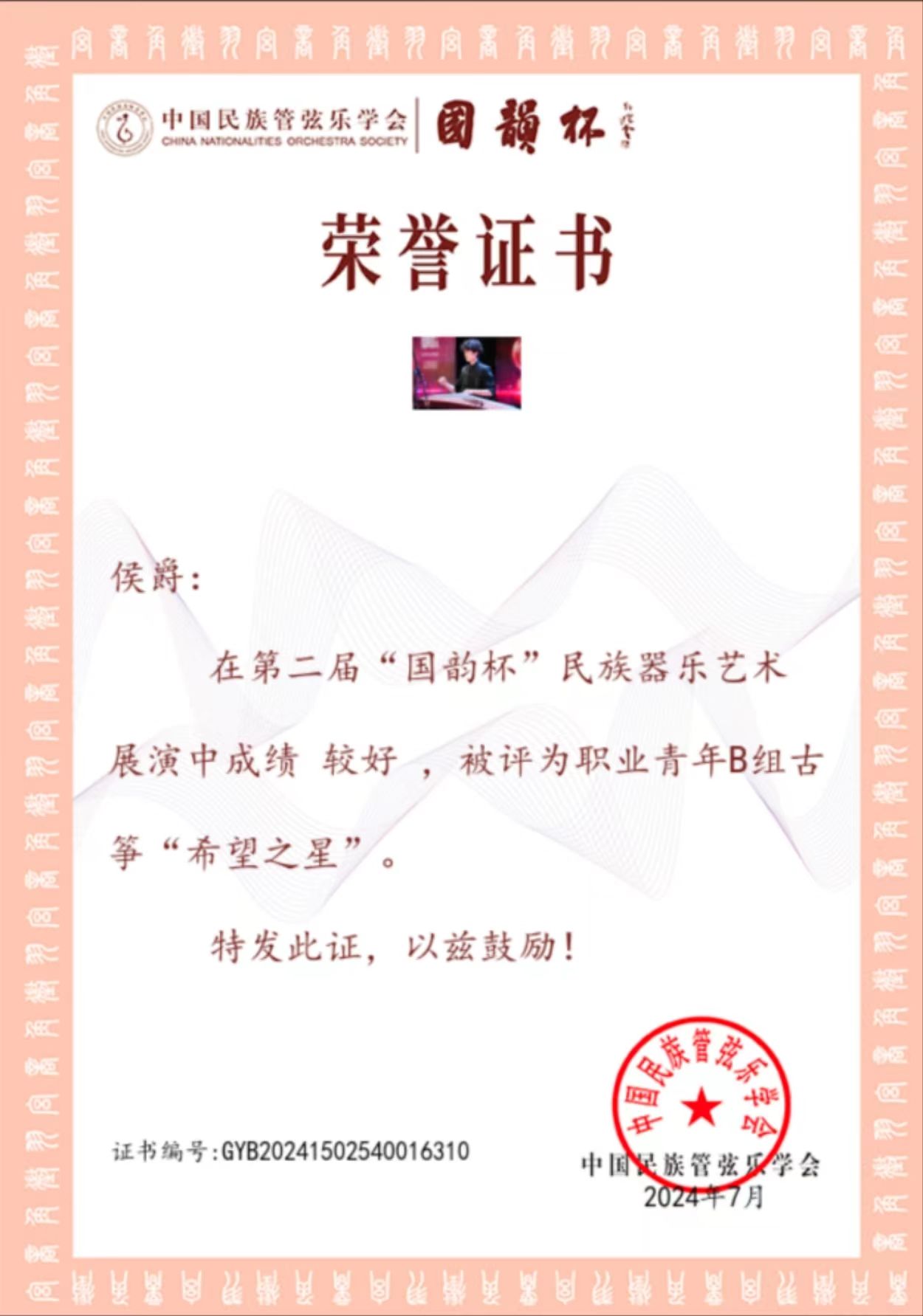 2024年7月20至25日,由中国民族管弦乐学会主办的第二届“国韵杯”民族器乐艺术展演于浙江宁波举行。滚球买球的app官网国乐系教师林恬、陈柯井指导的2023级本科生、第四届拔尖创新人才侯爵在展演中成绩较好,获评职业青年B组古筝“希望之星”。