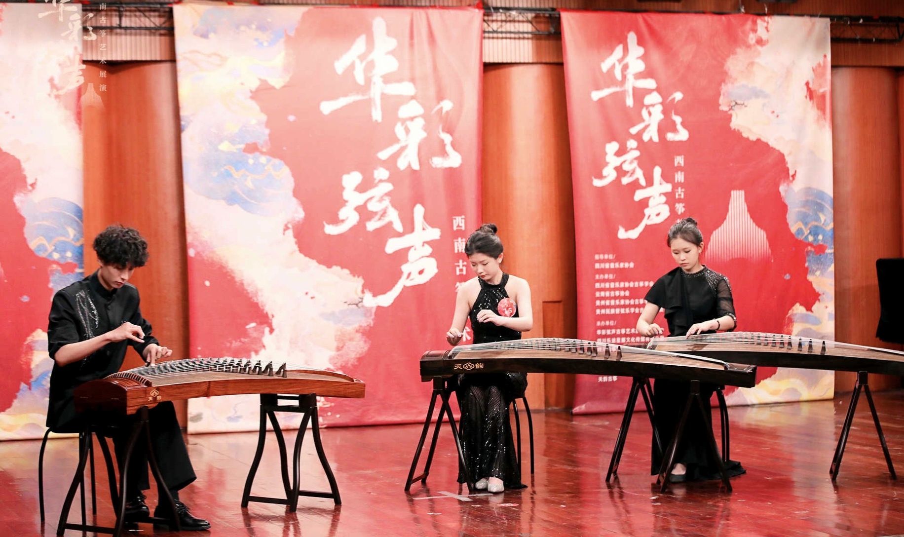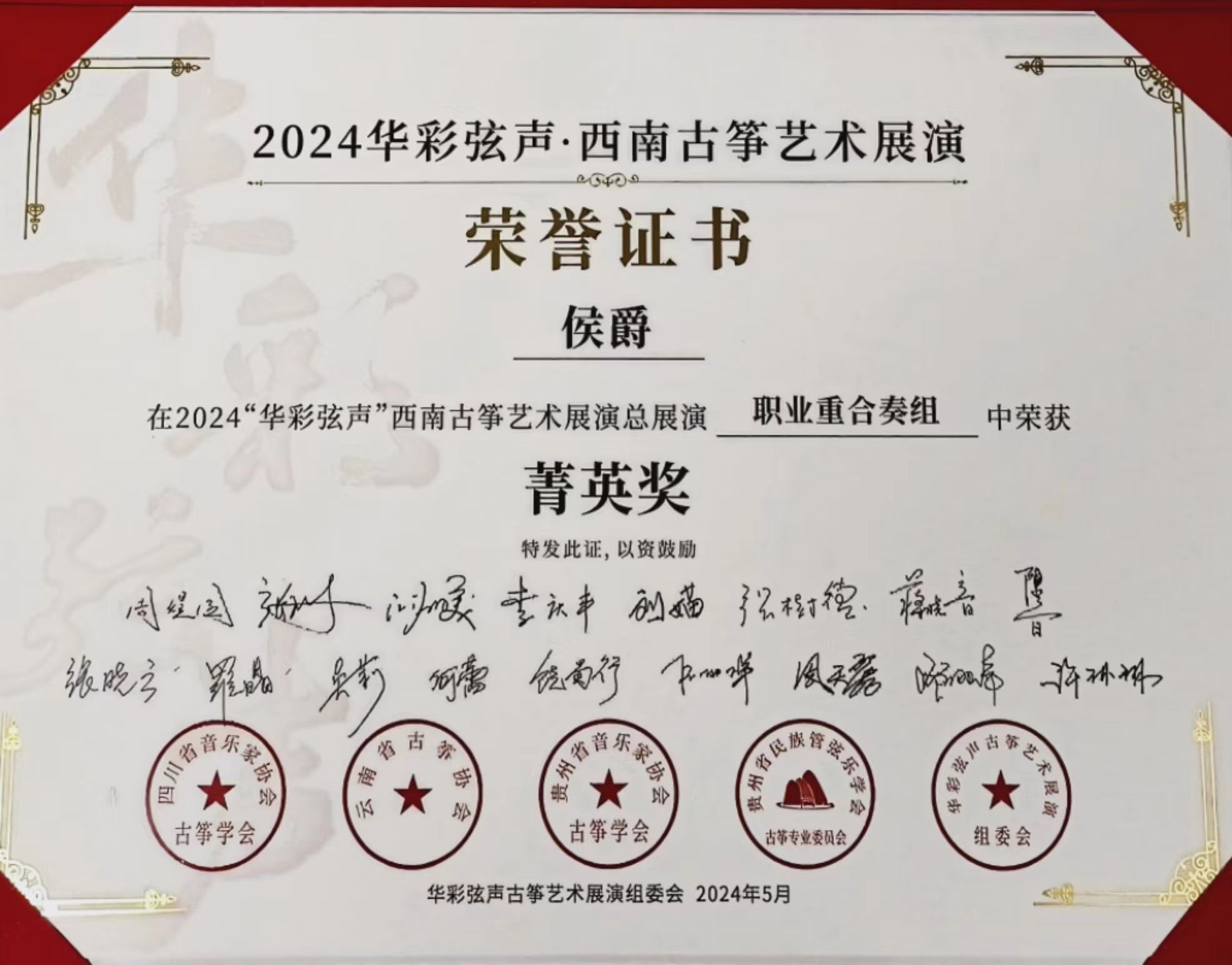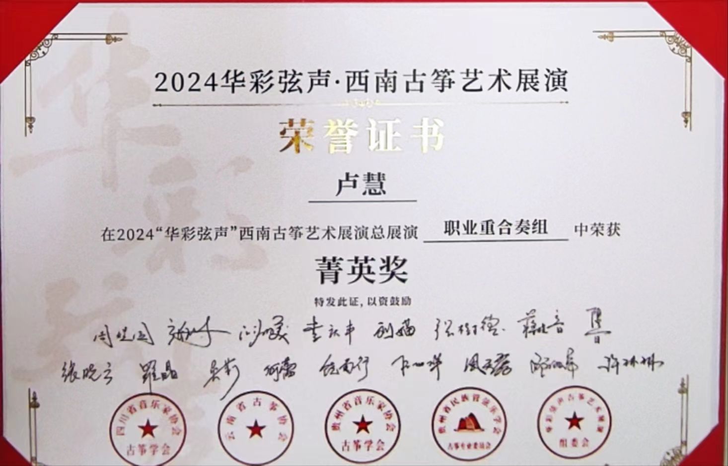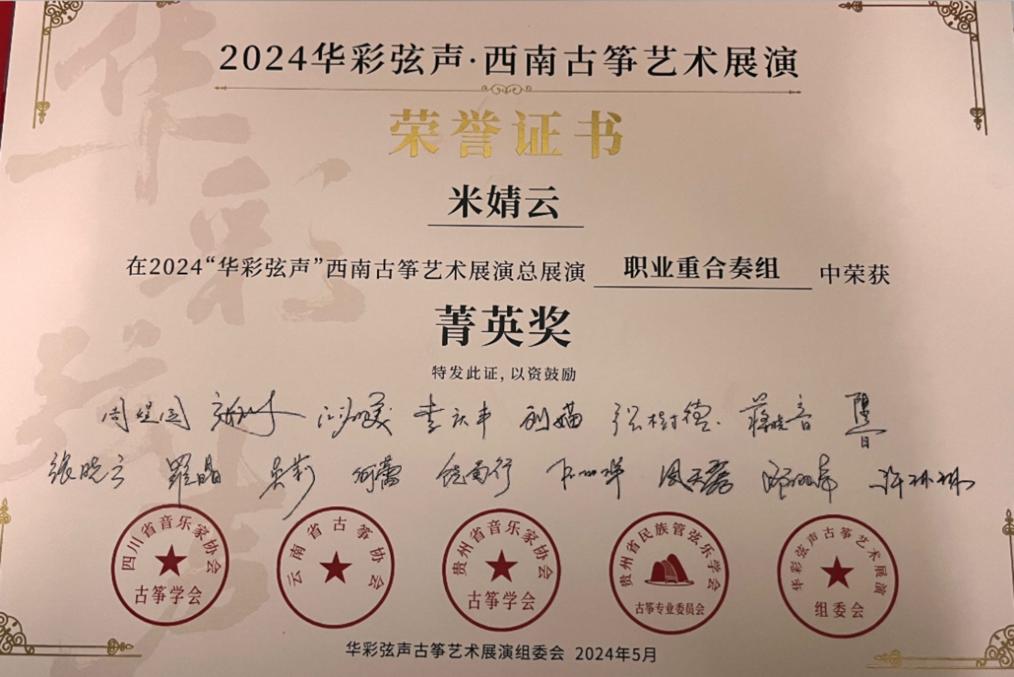 2024年5月1日至5日,由四川省音乐家协会指导,四川省音乐家协会古筝学会、云南省古筝协会、贵州民族管弦乐学会古筝专业委员会、贵州省音乐家协会古筝学会主办的“华彩弦声”第一届西南云贵川渝古筝艺术展演在四川滚球买球的app官网举行。滚球买球的app官网国乐系教师林恬、陈珂井指导的2023级学生侯爵、卢慧、米婧云荣获职业重合奏组菁英奖。