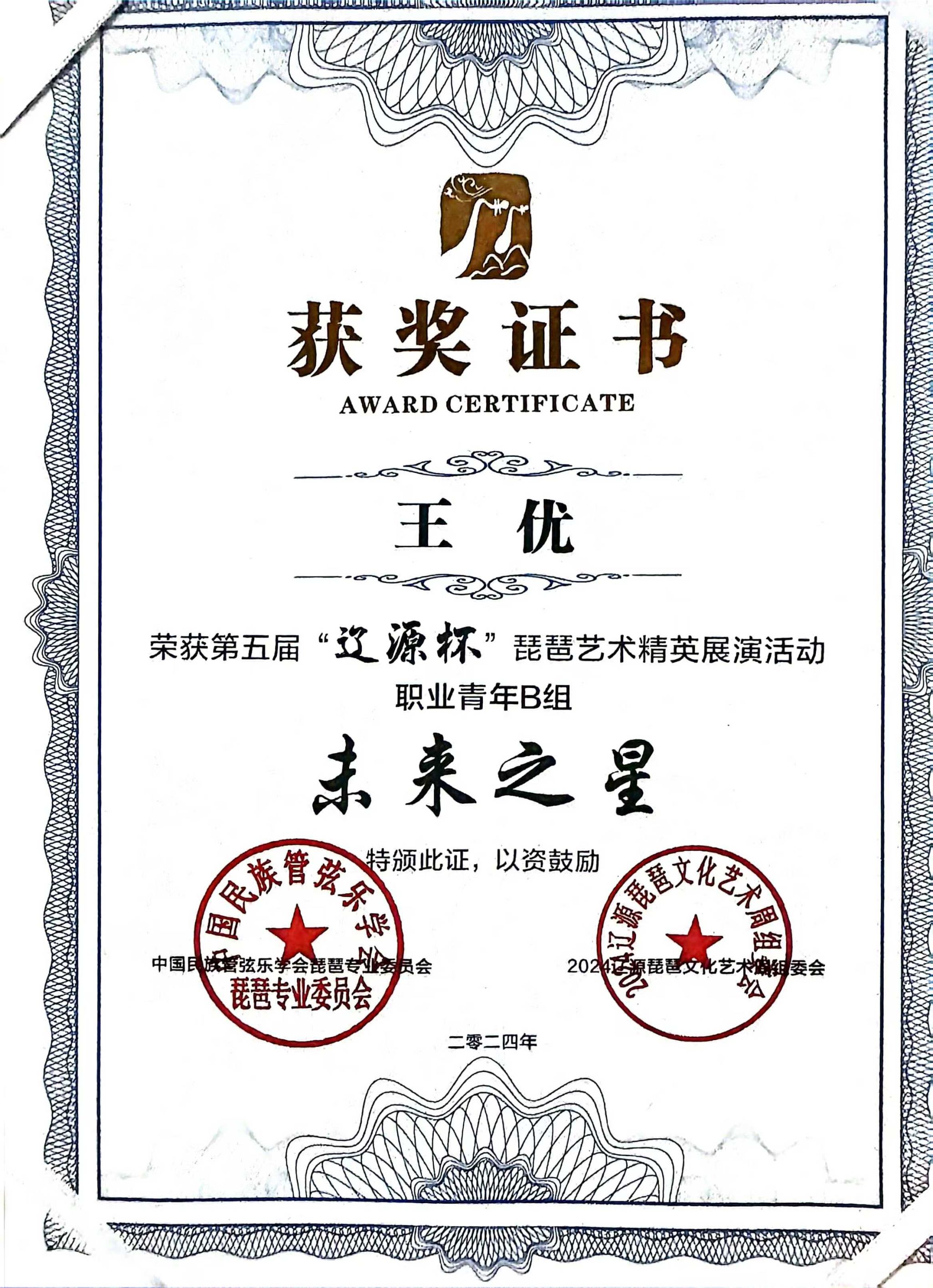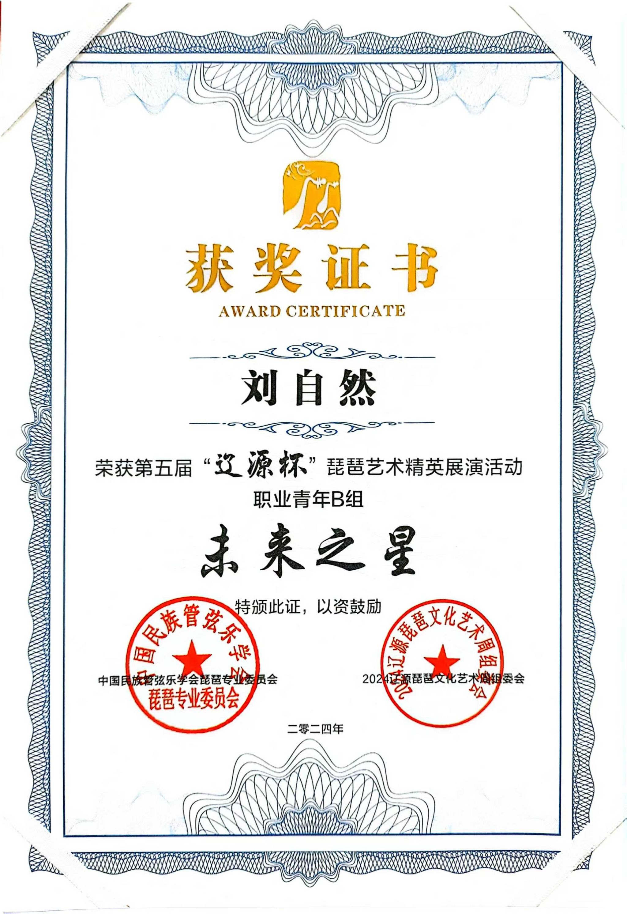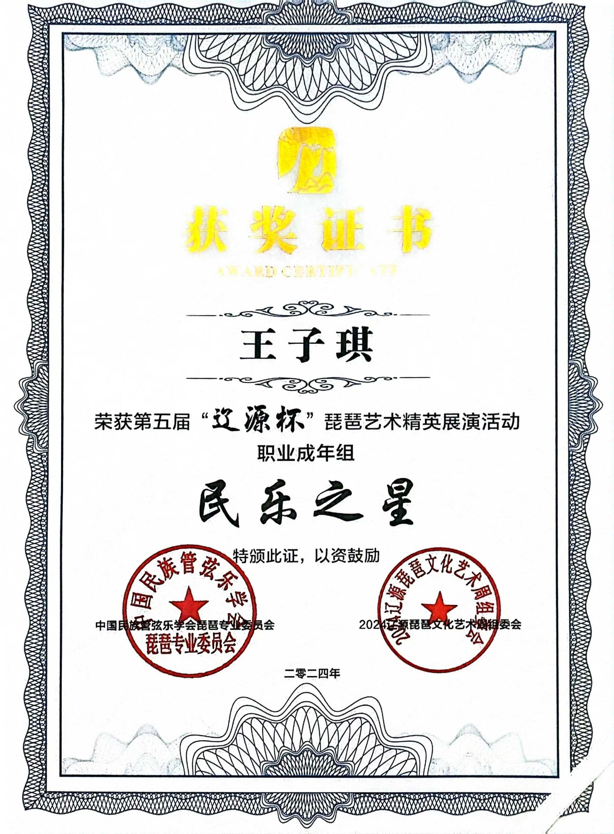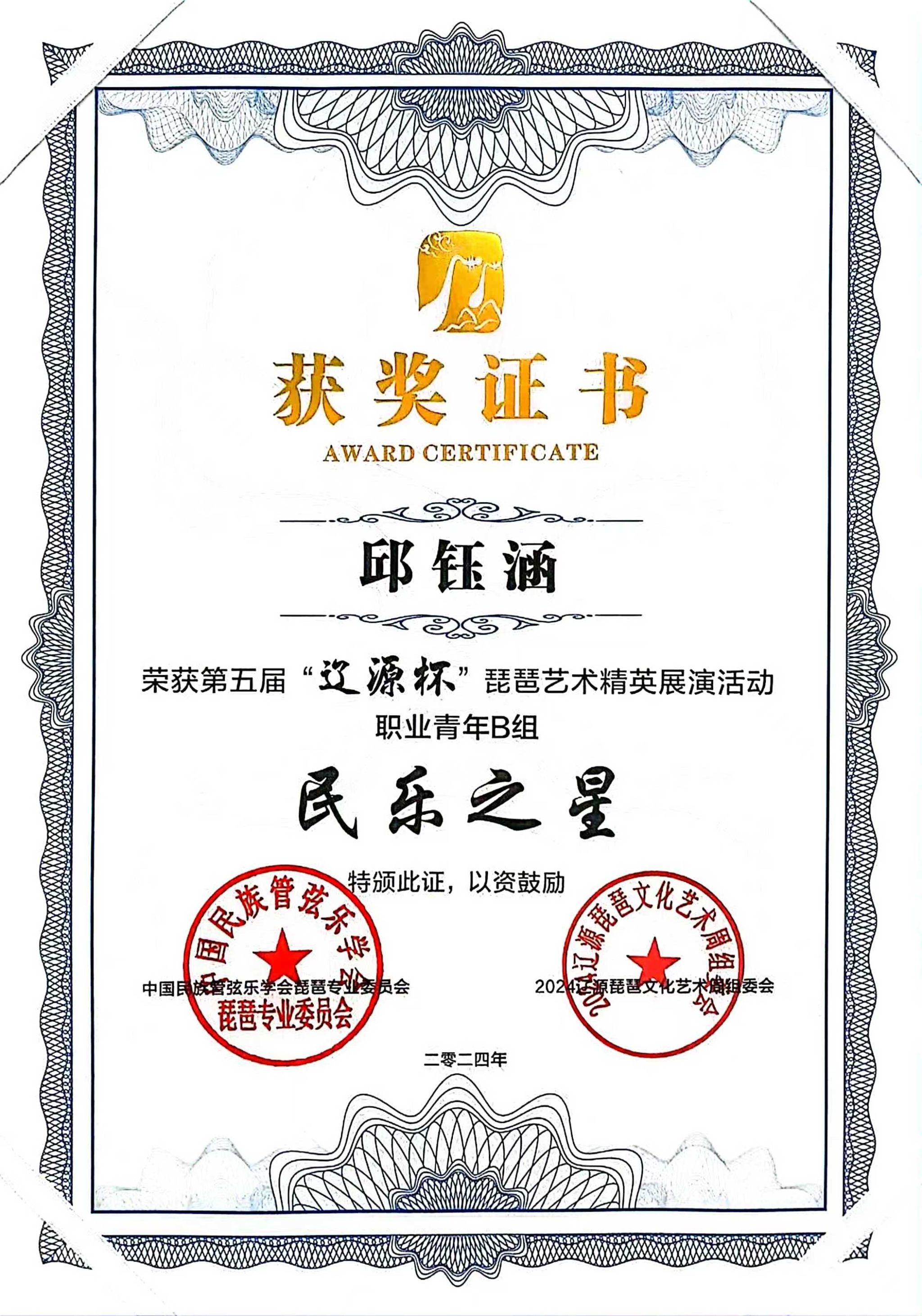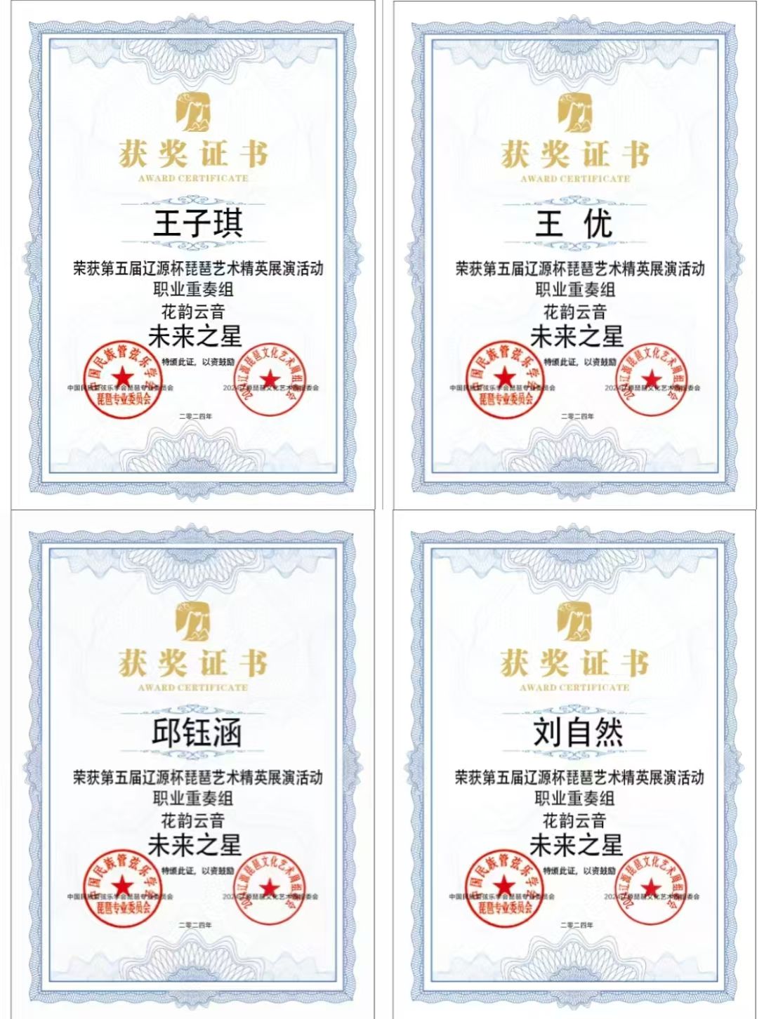 2024年8月1日至5日,由中共辽源市委、辽源市人民政府、中国民族管弦乐学会琵琶专业委员会、吉林省民族管弦乐学会主办的第五届“辽源杯”琵琶艺术精英展演活动在吉林省辽源市举行。滚球买球的app官网研究生班王子琪获职业成年组“民乐之星”,2023级国乐班邱钰涵获职业青年B组“民乐之星”,2020级国乐班王优、2023级国乐班刘自然分别获职业青年B组“未来之星”,由王子琪、王优、邱钰涵、刘自然组成的“花韵云音”获职业重奏组“未来之星”。国乐系教师赵红获“优秀指导教师”。