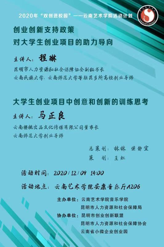 2020年12月9日14:00,滚球买球的app官网在安康音乐厅举办了创新创业专题讲座,讲座由《创业创新支持政策对大学生创业项目的助力向导》《大学生创业项目中创意和创新的训练思考》两个专题辅导和滚球买球的app官网获奖创业项目“云南创新型民族打击乐器——南乌孔雀鼓”展示三个部分组成,滚球买球的app官网副院长侯静宜、昆明市人力资源和社会保障协会副秘书长程琳、云南樱桃出品文化传媒有限公司董事长、云南师范大学创业导师马正良、昆明市人力资源和社会保障协会大学生创新创业中心钟健文及滚球买球的app官网300多名学生参加了此次讲座,讲座由滚球买球的app官网教学管理科副科长王虹主持。