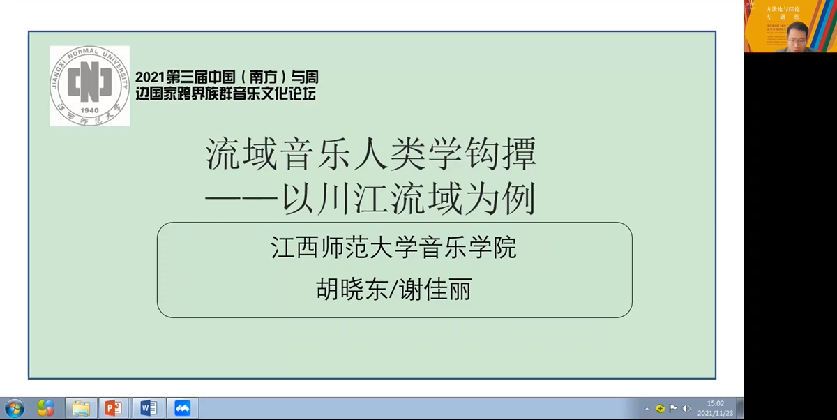 四组首先发言的是江西师范大学胡晓东、谢佳丽,他们的发言题目为《流域音乐人类学钩撢——以川江流域为例》,文章的主体分为整体性研究(历时性和共时性整体研究)、关系性研究、动态性体现(文化涵化与文化濡化)以及开放性体现(时空开放性、族群开放性)四部分。胡晓东谈到了近年来线性文化空间(景观)逐渐成为人类学研究的新热点,集中于对“流域”“通道”“走廊”等“路”文化空间的关系性探讨,采用线索民族志与多点民族志的视角去考察线性文化空间与音乐的互动与传播关系,成为音乐地理学研究的重要突破。流域音乐人类学研究的重要旨趣在于从多学科交叉融合方法到新文科的理论品质,流域音乐人类学具有整体性、动态性、关系性和开放性四大特点。作为路文化研究的重要组成部分,流域音乐人类学有效促进了线性音乐空间(景观)研究的多元纵深发展,开拓与丰富了民族音乐学研究的学术视野。新文科倡导构建系统性、整体性的知识体系,在这一理念的指引下,流域音乐学作为新民族音乐学研究的代表,应继续坚持以创新、开放的学术诉求,加强系统性构建,将这一研究领域夯实。