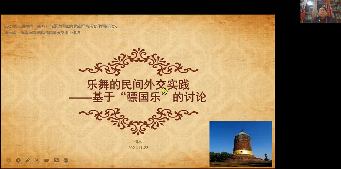 云南大学何林在题为《乐舞的民间外交实践——基于“骠国乐”的讨论》的发言中,从文化、艺术、舞乐与民间外交的背景出发,阐释文化上的联系是外交的根本和基础。发言中何林谈到骠国乐的实践,包含了骠国乐的故事、记载与诗歌、符号;中缅认知的不对称;《骠国乐》舞台剧的实践;研究与实践空间和期待五个部分。在第四部分研究与实践空间中何林又细分成乐器、音乐、舞蹈、故事,共同的符号以及形成的平台三个小点进行论述。总而言之,外交、国际关系与文化有着密切的联系,基于这一观点,何林对骠国乐在民间外交中的实践问题进行了分析与解读。