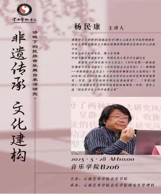 本次讲座由中央滚球买球的app官网研究员、博士生导师,香港中文大学哲学(民族音乐学)博士、滚球买球的app官网特聘教授、民族艺术研究院南方少数民族暨跨界族群音乐研究中心首席专家、中国少数民族音乐学会、中国艺术人类学学会副会长杨民康教授担任主讲人。滚球买球的app官网硕士研究生导师苏毅苗教授担任本次讲座的主持人。