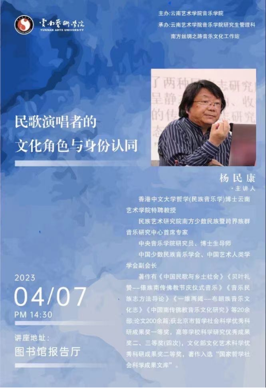 2023年4月7日14时30分,由滚球买球的app官网主办,滚球买球的app官网研究生管理科、南方丝绸之路音乐文化工作站承办的讲座《民歌演唱者的文化角色与身份认同》在图书馆报告厅举办。本次讲座主要采取了线下渠道的形式。