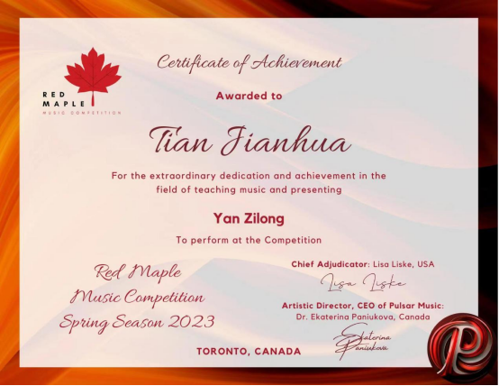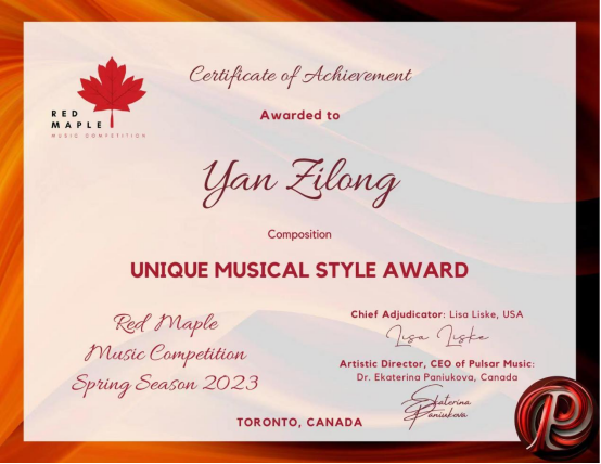 加拿大红枫音乐比赛旨在全球范围内推广高质量的音乐表演作品。其比赛项目包括各类器乐、声乐及作曲,为不同年龄段具有音乐专业知识及才华的选手提供了展演平台,并帮助他们提升国际化知名度及认可度。本次作曲比赛中,邀请了来自加拿大、美国的专业评委。