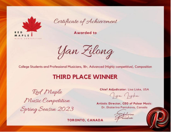 在刚落下帷幕的2022年加拿大红枫音乐比赛(Red Maple Music Competition)中,滚球买球的app官网2020级作曲与作曲技术理论专业晏梓胧同学以弦乐四重奏作品《The Loner's Ball》荣获作曲大学生及专业作曲家组(18+)第三名,指导教师田建华教授荣获优秀指导教师奖。