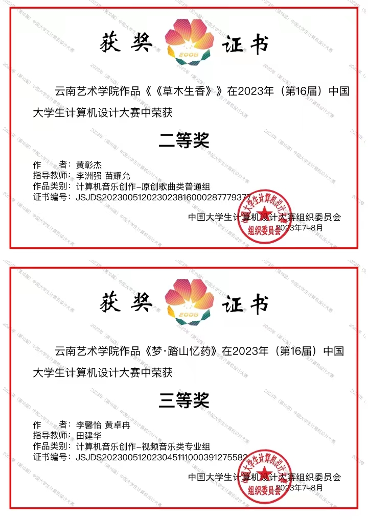 2023年(第16届)中国大学生计算机设计大赛决赛于8月19日开幕、8月21日落幕,该赛事汇集了来自全国各大高校的精英学子,其中计算机音乐创作组由全国各大高校共161件作品进入决赛。滚球买球的app官网作曲系教师、音乐教育系教师指导的两个作品以云南省一等奖的成绩进入国家级决赛,分别斩获二等奖及三等奖。