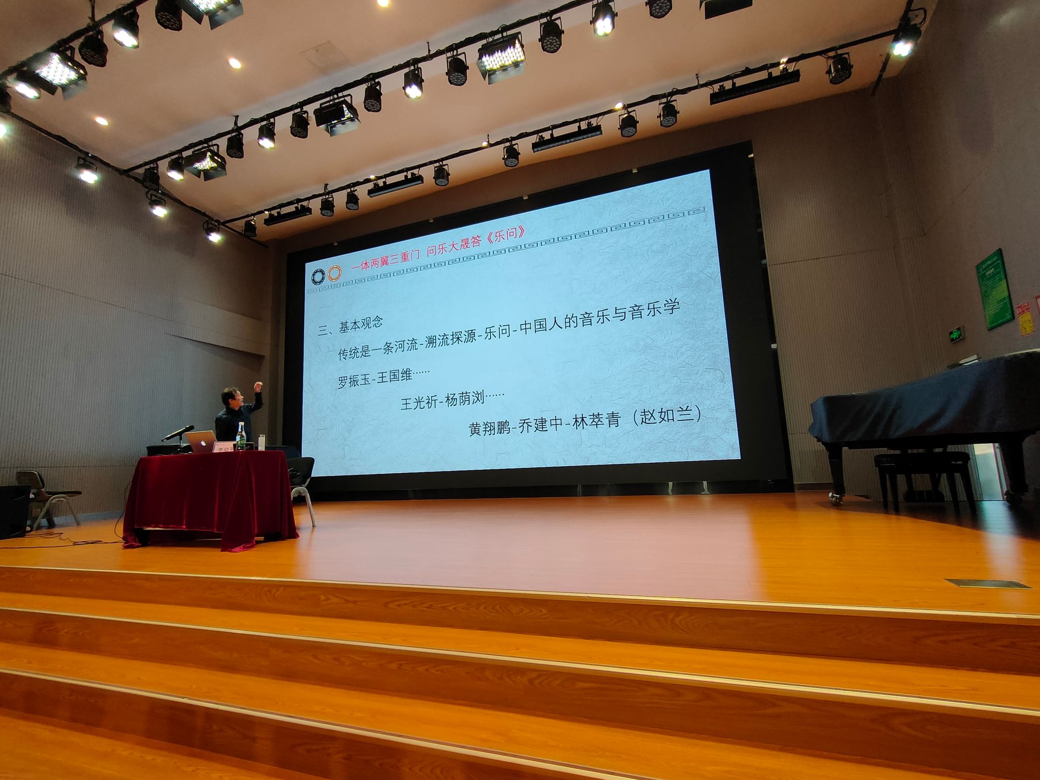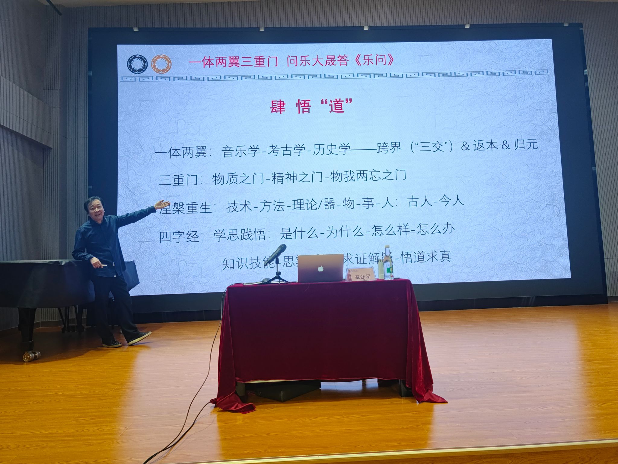 李幼平教授以个人博士论文《大晟钟与宋代黄钟标准音高研究》中,采用“音乐史的选题、考古学的方法回答了历史学问题”这一实际案例,阐述本次讲座以音乐学为体、历史学与考古学为两翼,将物质之门、精神之门、物我两忘之门为三重之门的治学之道,引导学院师生在学术实践中结合本专业特色的同时做到创新性转换和创造性发展,注重学术内涵的同时探究其实际运用价值。