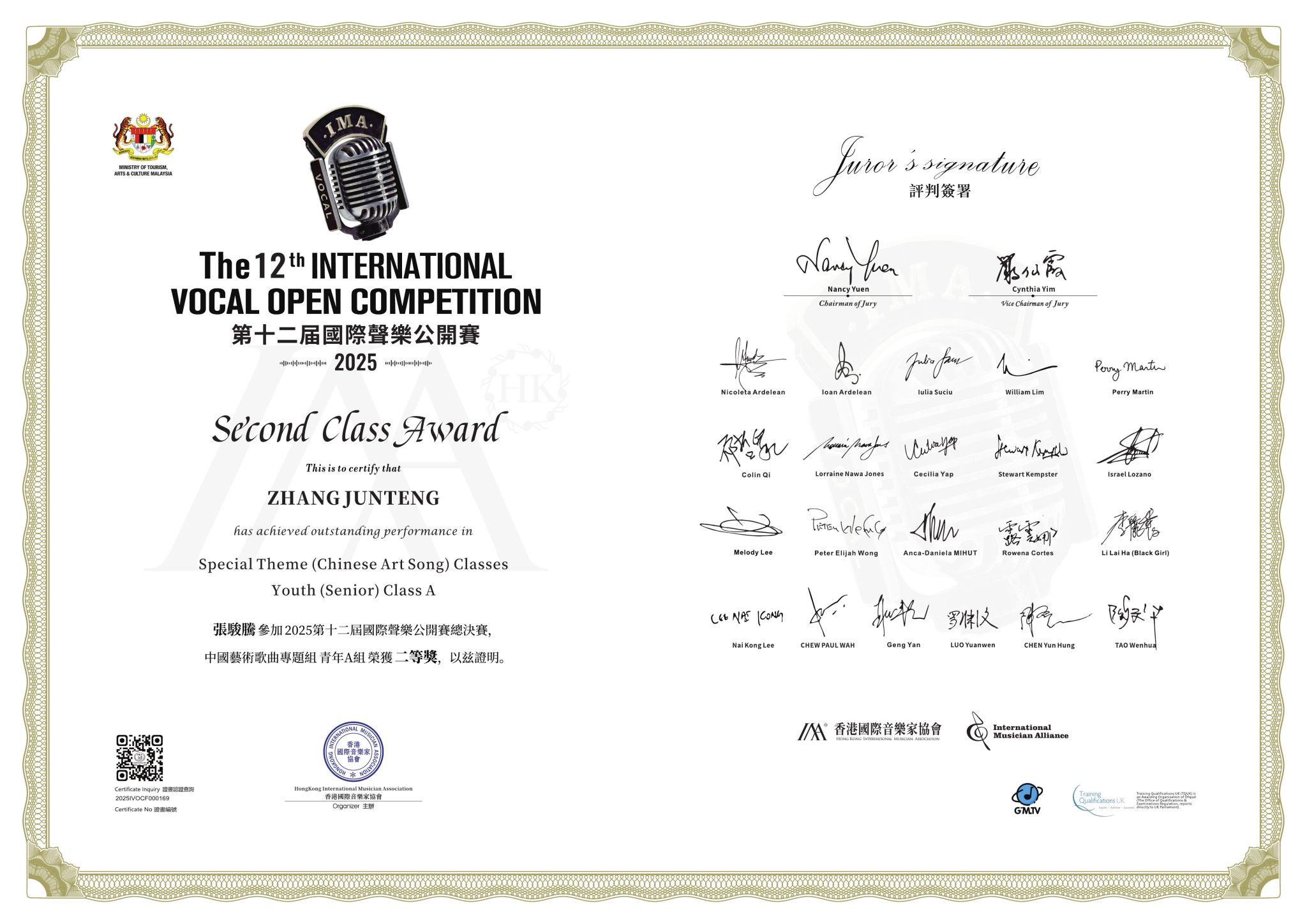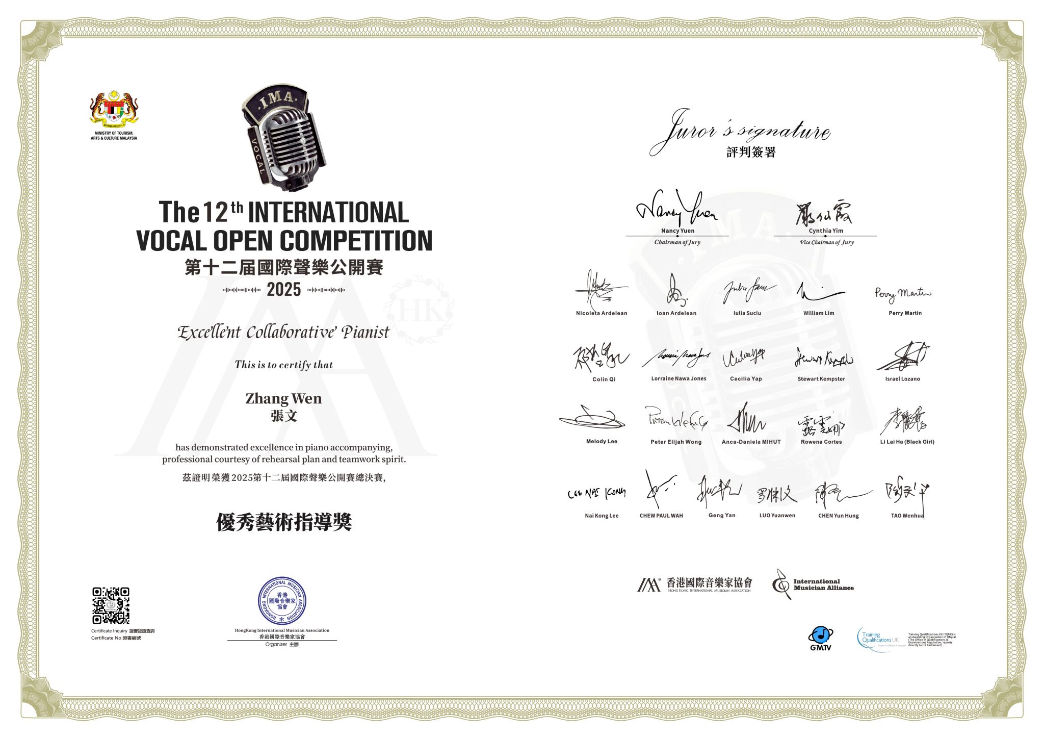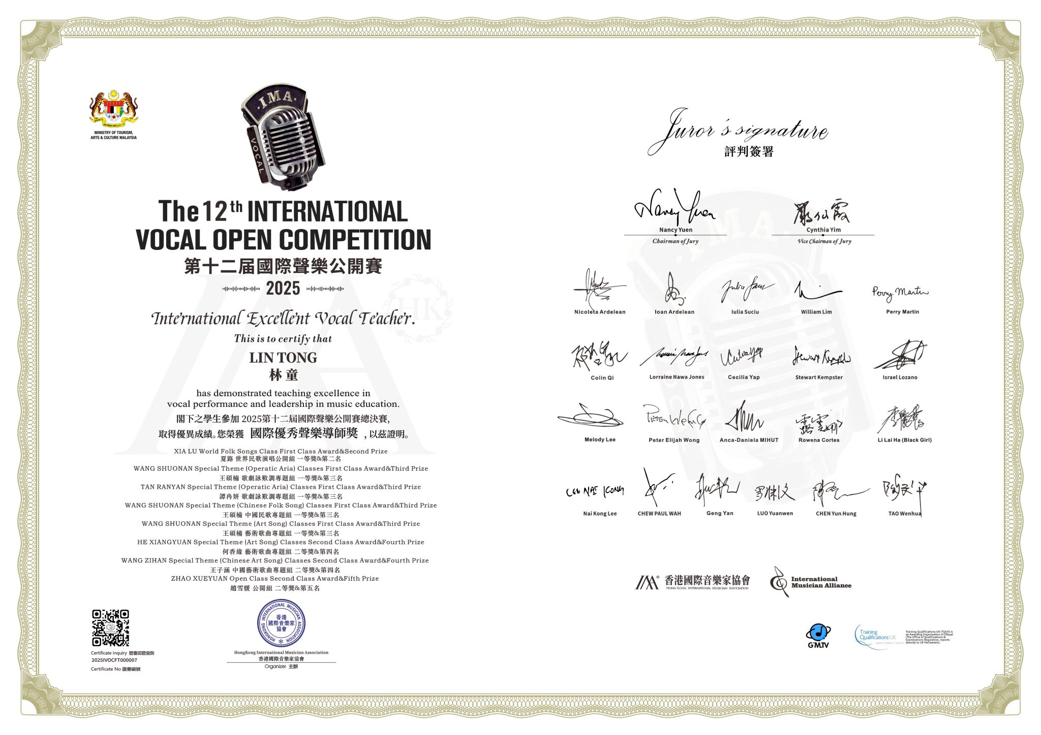 2025年1月17日—21日,2025年第十二届国际声乐公开赛全球总决赛在马来西亚·吉隆坡举行。滚球买球的app官网声歌系师生喜获佳绩:硕士研究生夏路荣获世界民歌演唱公开组一等奖,硕士研究生谭冉妍荣获歌剧咏叹调专题组青年A组一等奖,硕士研究生何香缘获得艺术歌曲专题组青年A组二等奖,硕士研究生张骏腾获得中国艺术歌曲专题组青年A组二等奖,本科生王子涵获得中国艺术歌曲专题组青年A组二等奖,硕士研究生何香缘获得歌剧咏叹调专题组青年A组三等奖,硕士研究生李蕊彤获得歌剧咏叹调专题组青年B组三等奖 ;林童教授荣获“国际优秀声乐导师奖”,青年教师张文荣获“优秀艺术指导奖”。