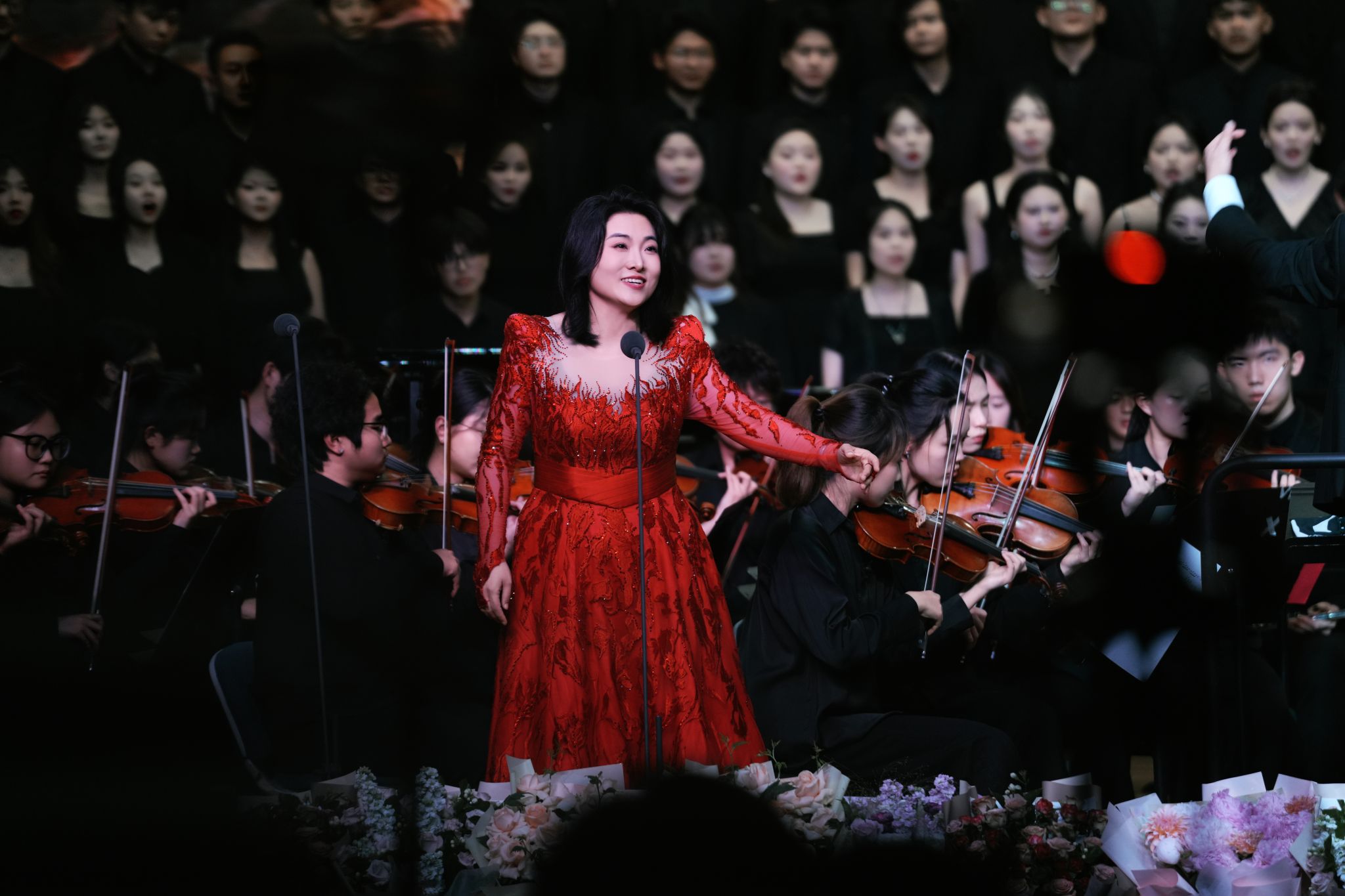 下半场,由合唱系教师张红彬以极具感染力的指挥风范,携手合唱系、民族声乐系、声乐歌剧系的尹伟、杨丽霞、刘英梓、李婷婷、罗聪鹏、杨扩以及薛文静共7位教师实力领唱,用歌声深情诉说长征故事;滚球买球的app官网青年交响乐团以磅礴演奏为演出注入强大艺术张力;郝悦晴、王鑫浩两位同学通过铿锵的朗诵,丰富了作品的艺术层次。2021、2022级合唱班113名同学以饱满热情与专业素养,共同演绎中国经典合唱声乐套曲《长征组歌》。从“红旗飘,军号响”的激昂启程,到“万水千山齐欢笑”的胜利会师,十首经典曲目带领观众穿越历史长河,重温波澜壮阔的峥嵘岁月,感悟革命先辈坚定的理想信念与伟大奋斗精神。