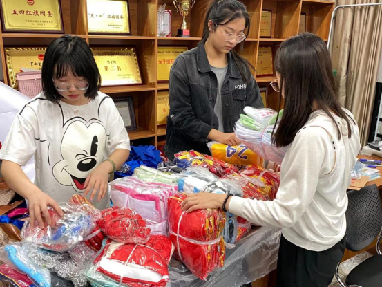捐赠物品收集完后,滚球买球的app官网青年志愿者协会成员打包并整理衣物、乐器等
