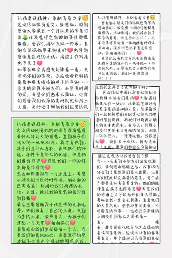 一份情一份爱心,涓涓细流能汇成了江海,我们深信只要人人都献出一份爱,世界将会变得美好人间。通过这次志愿捐赠活动,向榜样雷锋同志学习,使参与活动的同学不断深入学习贯彻了习近平总书记在党史学习教育动员大会上的重要讲话精神,紧紧围绕学史明理、学史增信、学史崇德、学史力行,做一些力所能及的奉献爱心和关爱活动,进一步增强“四个意识”、坚定“四个自信”、做到“两个维护”,坚定不移跟党走中国特色社会主义道路。同时也通过此次活动,增强了西南边疆与北疆同胞的血肉联系,虽然我们身隔千里,党的光辉照边疆,边疆人民心向党,各族人民团结一心,共同为全面建设社会主义现代化国家、实现中华民族伟大复兴中国梦贡献青春力量。