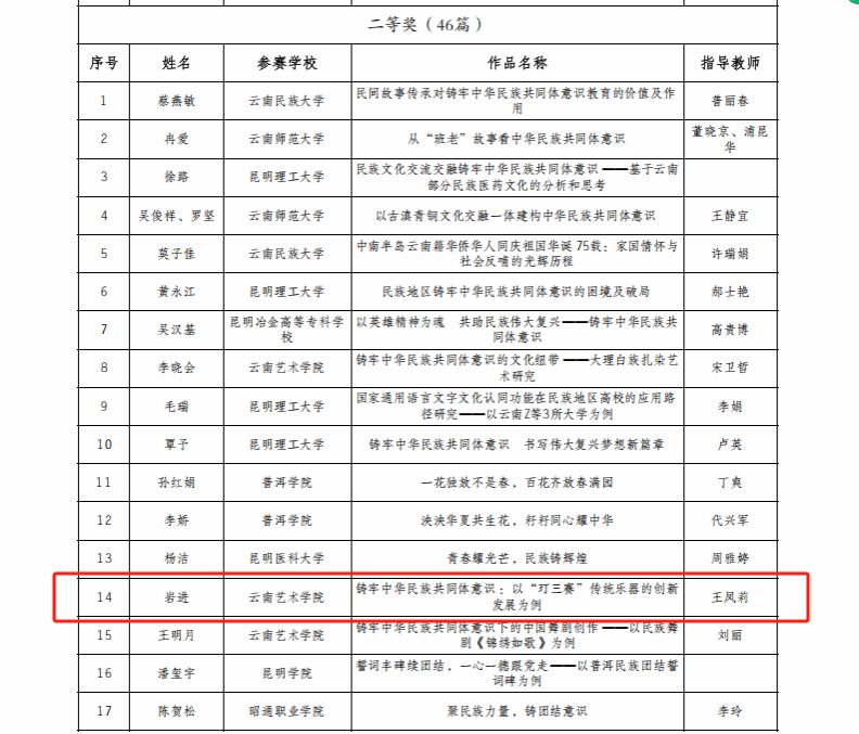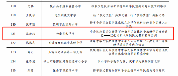 为深入学习贯彻习近平总书记关于加强和改进民族工作的重要思想和全国民族团结进步表彰大会精神,持续深化学校铸牢中华民族共同体意识教育、不断丰富教育实践活动形式,省教育厅、省民族宗教委组织开展了2024年度云南省学校铸牢中华民族共同体意识教育征文活动。滚球买球的app官网国乐系教师施劝耘《中华民族共同体背景下云南多民族地区音乐教学的渗透路径——以滚球买球的app官网民族器乐教学为例》获教师组一等奖,2021级民族音乐理论班学生岩进《铸牢中华民族共同体意识:以“玎三赛”传统乐器的创新发展为例》(指导教师:王凤莉)获大学生组二等奖。