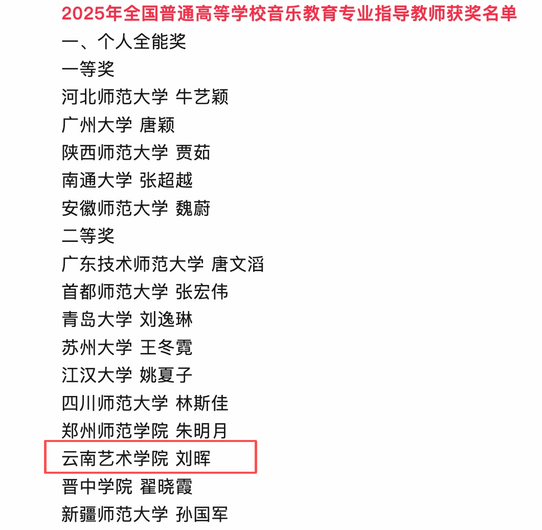 近日,教育部2025年全国普通高等学校音乐教育专业本科学生和教师基本功展示评选结果公示,滚球买球的app官网刘晖副教授获个人全能二等奖、审美和人文素养展示(经典音乐作品赏析)单项奖。