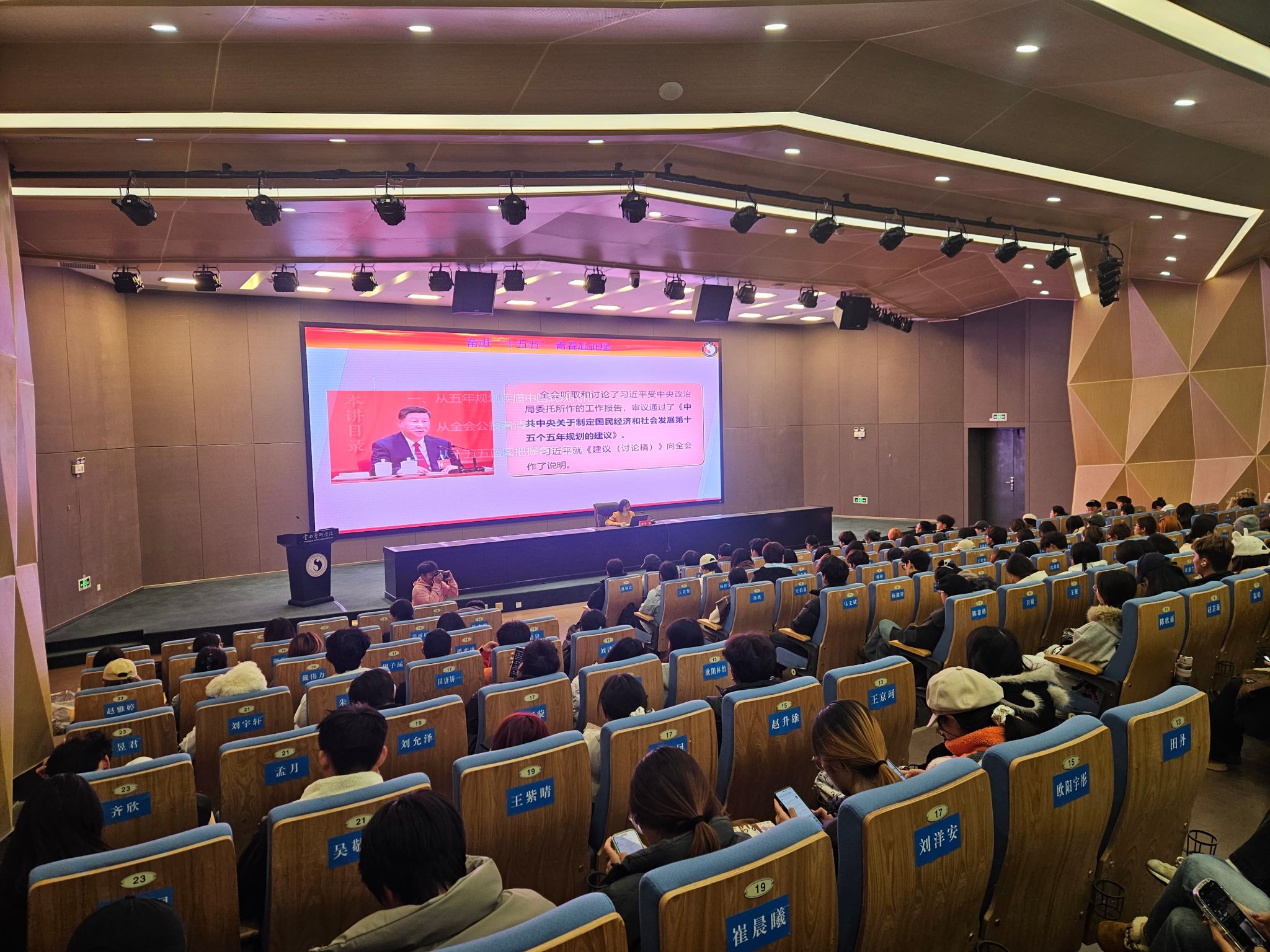 12月17日19:30,马克思主义学院副教授牛宇老师以《奋进“十五五”,青春赴征程——深入学习贯彻党的二十届四中全会精神》为主题作专题辅导。牛老师从五年规划的历史脉络和战略意义出发,系统阐述了“十五五”时期在全面建设社会主义现代化国家新征程中的关键作用,引导学生干部在深刻理解国家战略的基础上,找准艺术专业学生的担当方向,以文化自信筑牢思想根基,以艺术专长服务社会需求,真正将个人理想融入国家发展大局。