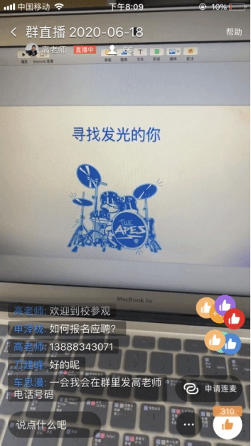 “寻找发光的你”2020年6月18日晚7:00,滚球买球的app官网联合悦鼓艺术培训学校在钉钉平台上为2020届毕业生举办了一场别开生面的直播招聘会。