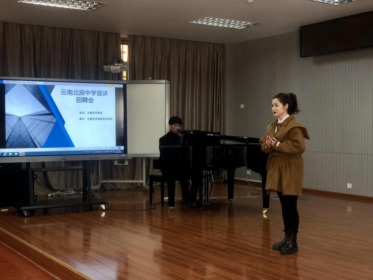 宣讲招聘会开始后,在播放学校宣传片的基础上,云南北辰中学的何振文副校长做现场宣讲,向参加应聘的学生介绍学校的基本情况和此次招聘的需求情况。