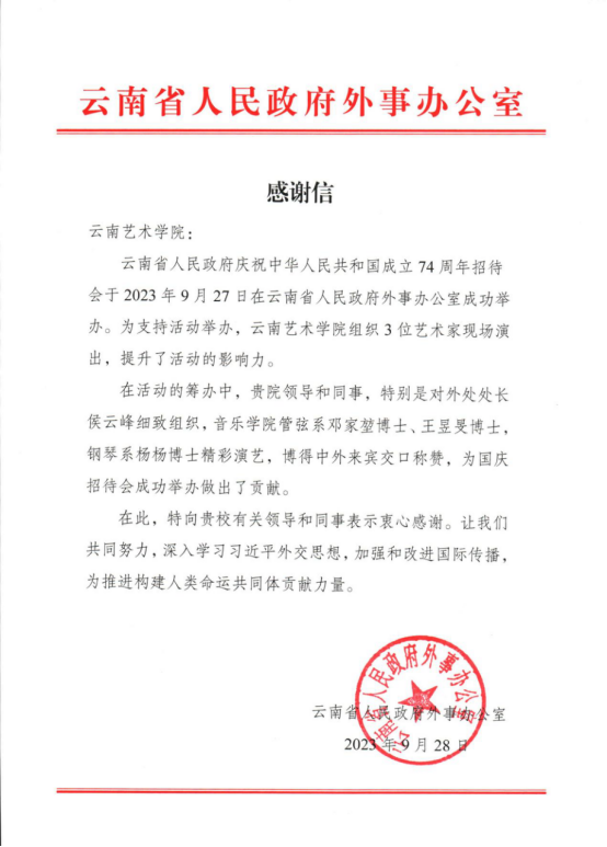 云南省人民政府外事办公室致滚球买球的app官网感谢信