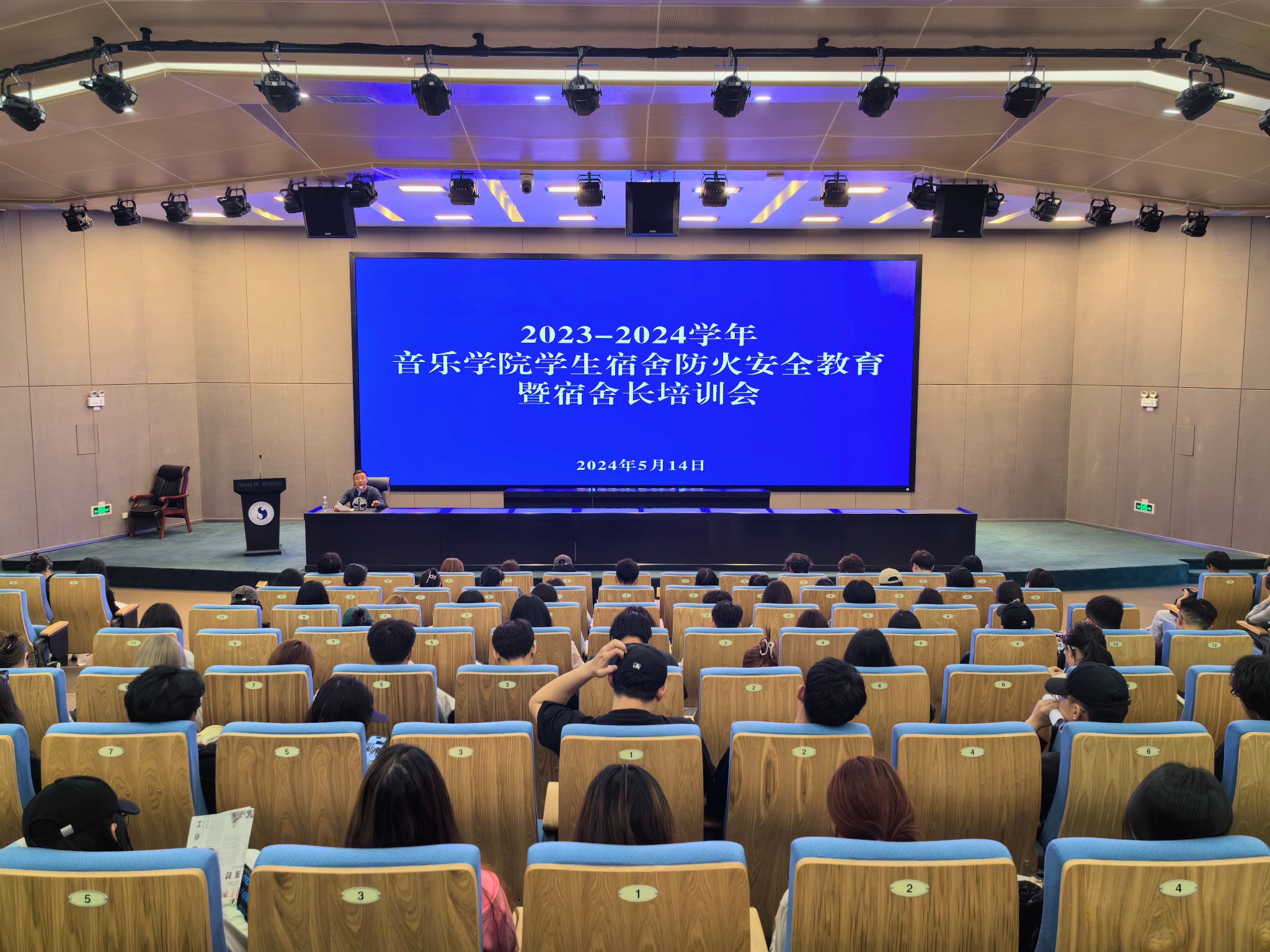 2024年5月14日19时,2023-2024学年春季学期滚球买球的app官网学生宿舍防火安全教育暨宿舍长培训会在学校图书馆报告厅举办。学生处宿舍管理科科长赵鹍作专题培训。滚球买球的app官网全体辅导员、全体宿舍长参加会议。