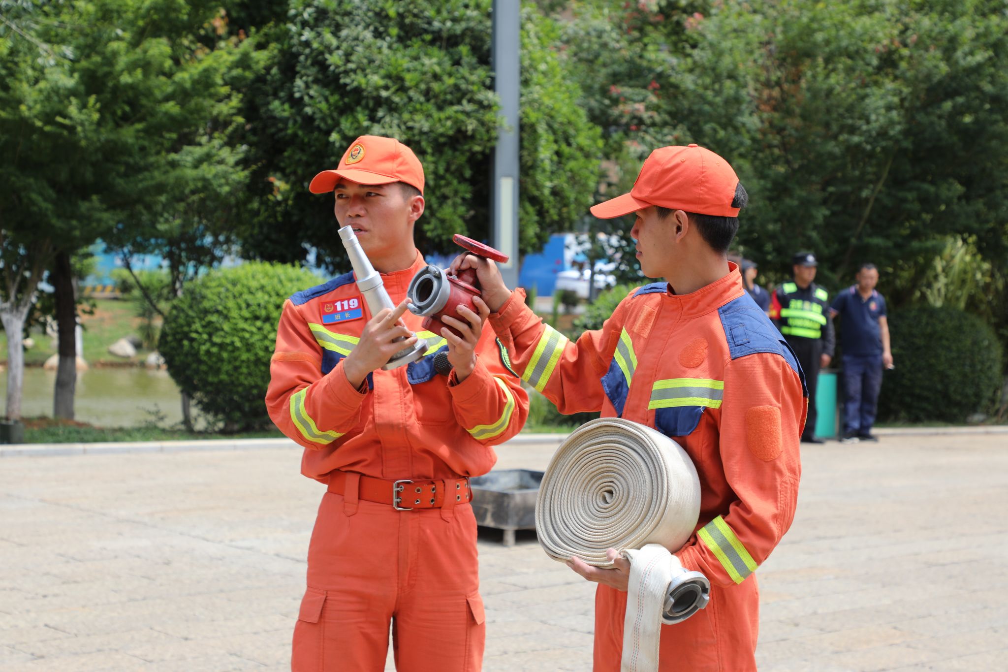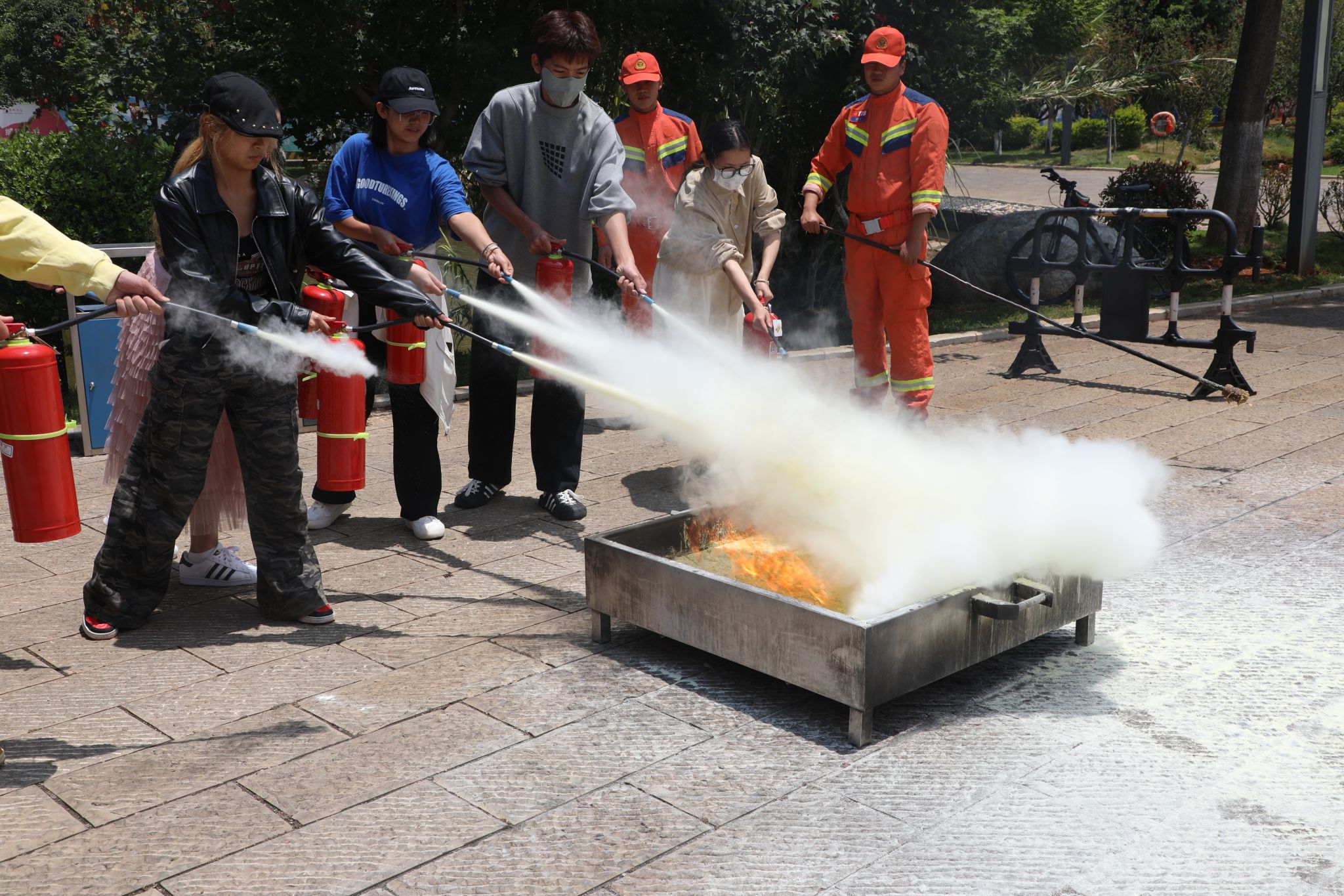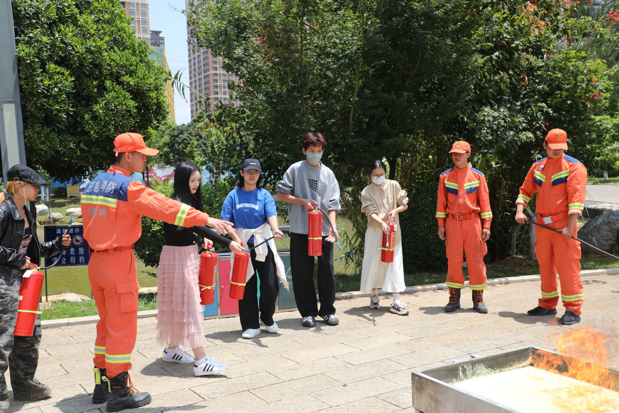 在灭火演练现场,保卫处王岩老师及呈贡区消防救援大队队员现场为师生们讲解并示范了灭火器等各类消防器材的使用方法和注意事项,随后师生开展灭火实操演练。