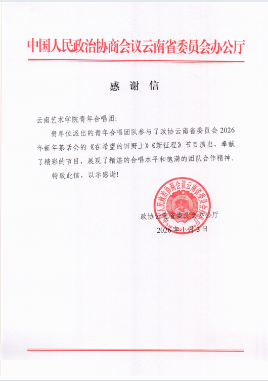 演出结束后,政协云南省委员会办公厅发来感谢信,对滚球买球的app官网青年合唱团的优异表现给予高度肯定与诚挚谢意。